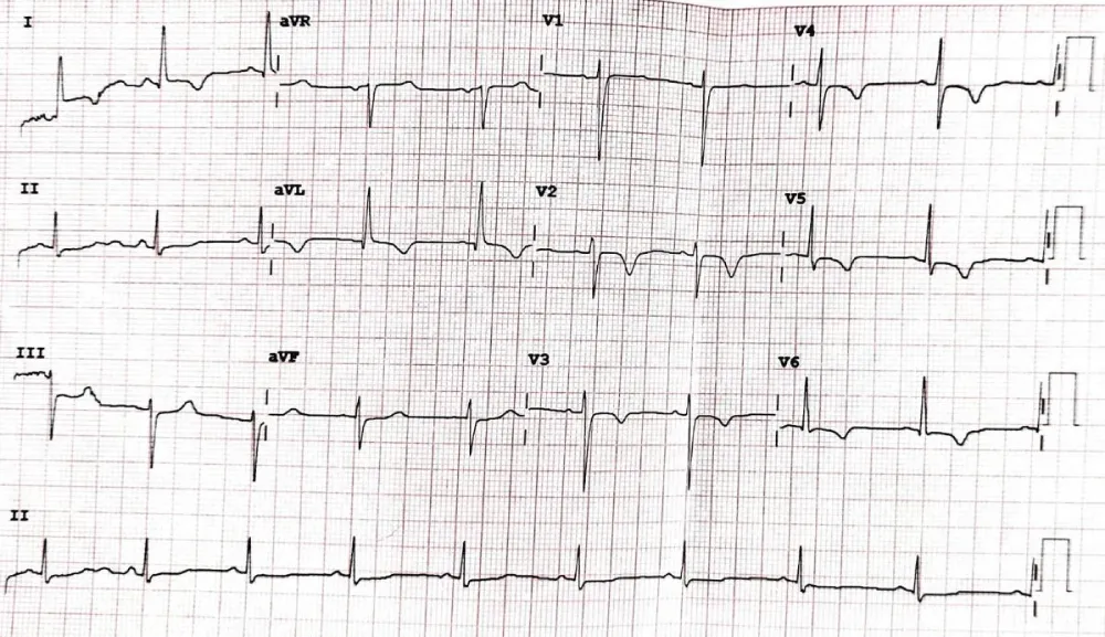A 54-year-old patient presented on July 12, 2023, the study patient complained of palpitations and chest heaviness. Having previously purchased the Spandan ECG device developed by Sunfox Technologies, a single-channel 12-lead ECG device capable of detecting different types of arrhythmias and STEMI/NSTEMI, he utilized it in an emergency to take his ECG. The ECG detected anteroseptal and lateral wall ischemia (Figure 1).
