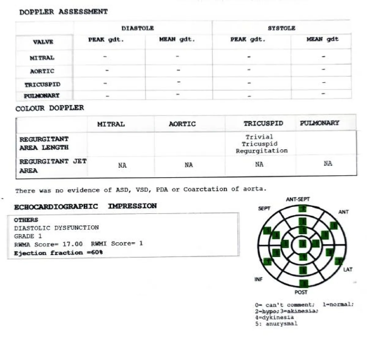 On August 1, 2023, an echocardiogram at the Hospital revealed Grade I diastolic dysfunction, RWMA score of 17, RWMI score of 1, and an ejection fraction of 60% (Figure 4).