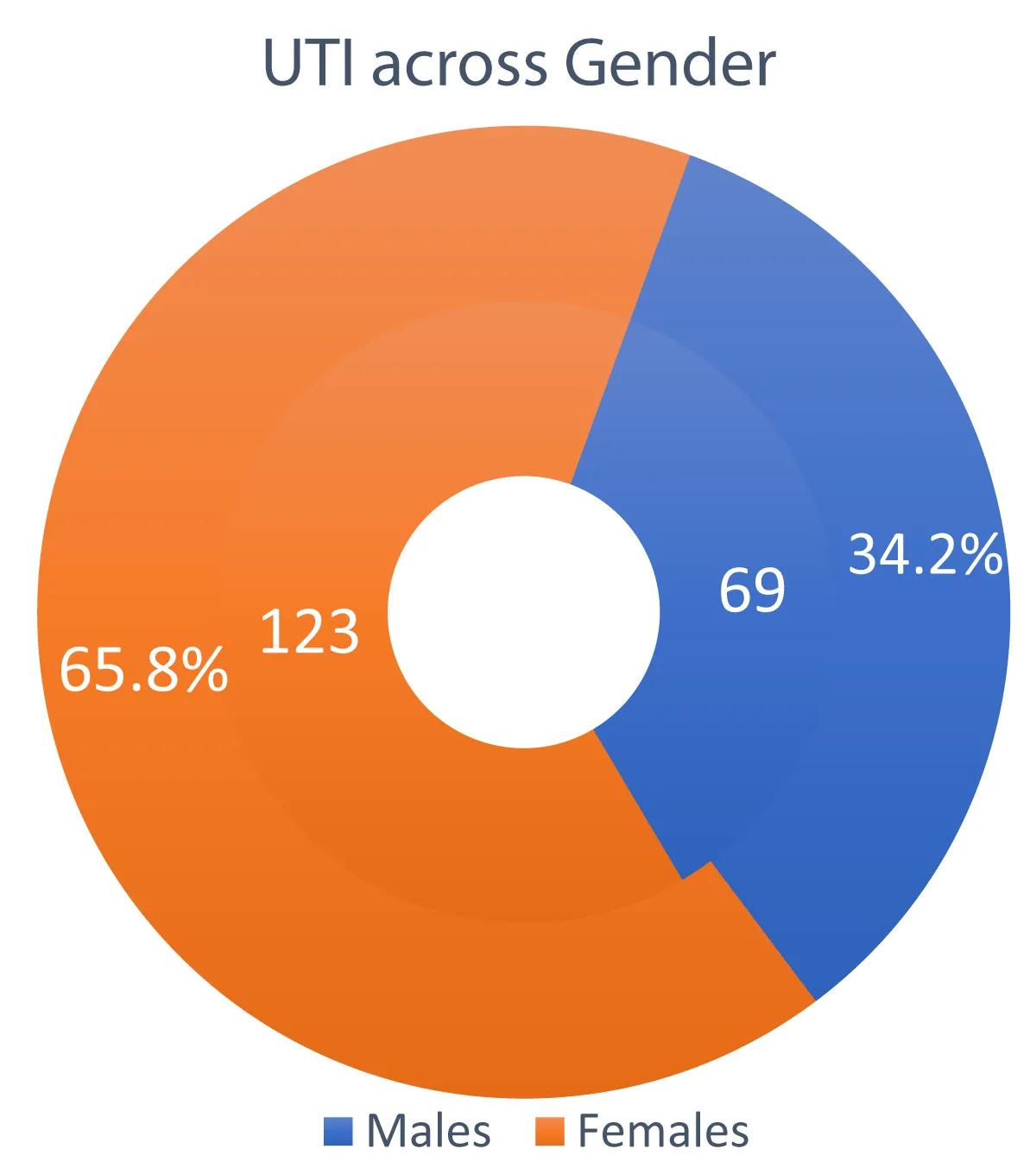 Urinary tract infection was more prevalent in females compared to male patients in the study and its distribution across genders is shown in Figure 1.