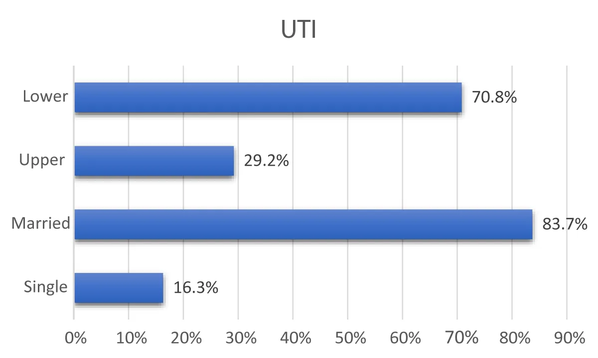 Figure 2 shows that 143 (70.8%) patients out of 202 patients were diagnosed with lower UTI while 59 (29.2%) patients were diagnosed with upper UTI. Furthermore, married couples were identified as comparatively more prevalent subjects with the diagnosis of UTI compared to single patients: 169 (83.7%) vs. 33 (16.3%).