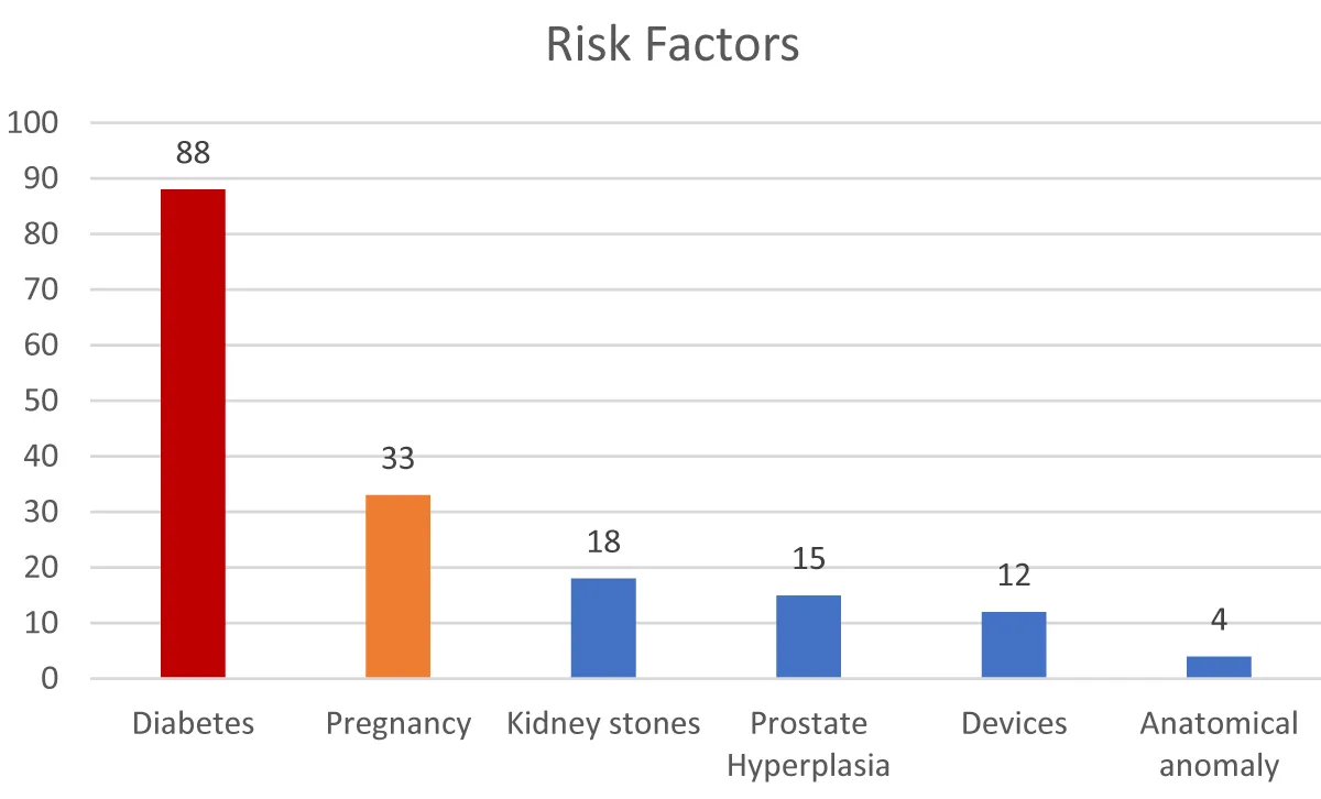 Figure 3 shows the frequency of risk factors or associated conditions in chronological order in patients with urinary tract infections. Diabetes was shown the most common one followed by pregnancy, kidney stones, etc. respectively.