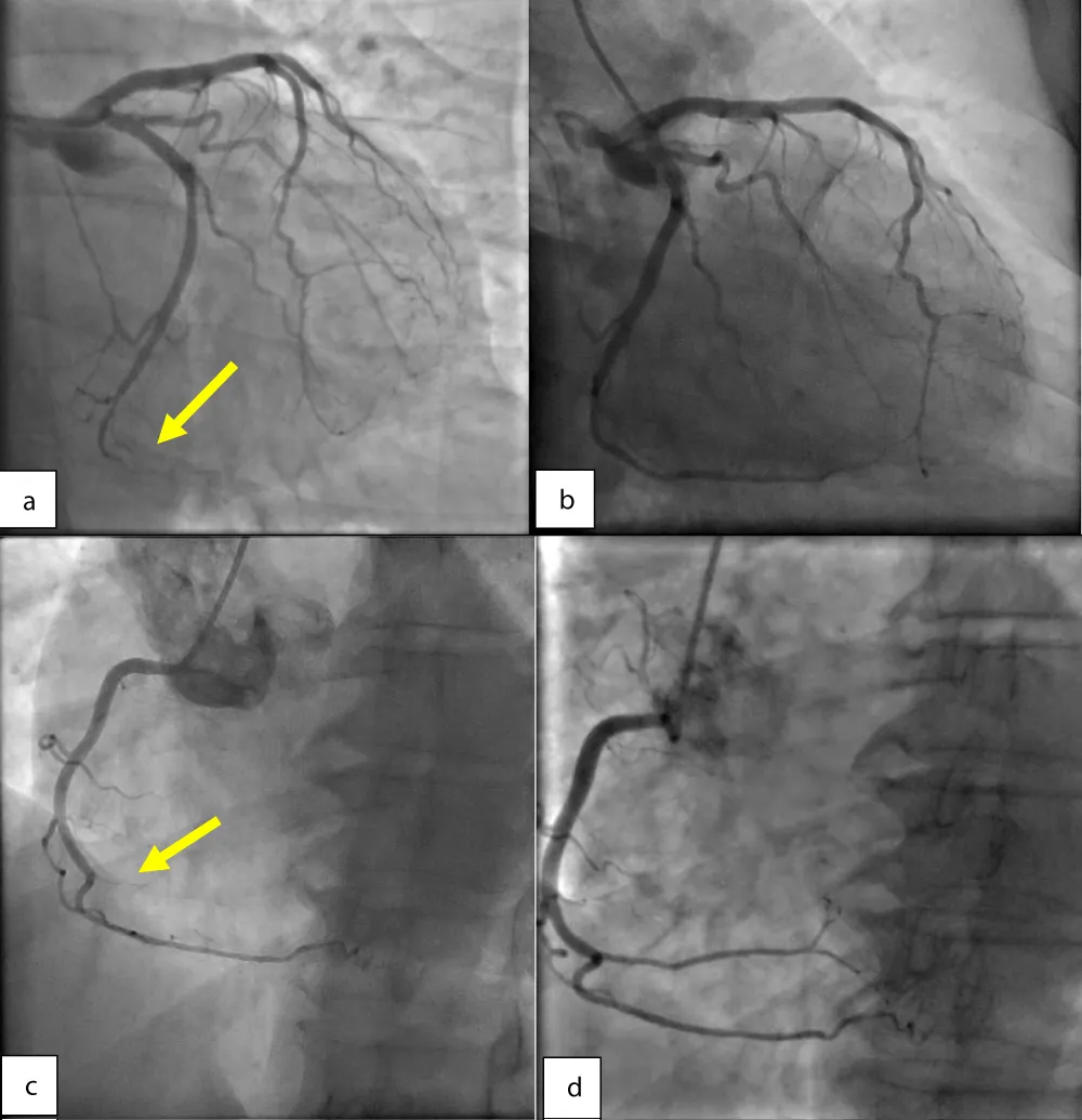 Figure 1: a. AP-30° CAUDAL angiogram view, showing a type 4 SCAD of proximal third obtuse marginal; b: AP-30° CAUDAL angiogram view, acquired in 2017 showing patency of proximal third obtuse marginal. c: Left anterior oblique (LAO) 30° angiogram view acquired in 2017, showing a type 4 SCAD of PLA; d: Left anterior oblique (LAO) 30° angiogram view, showing spontaneous reperfusion of PLA.