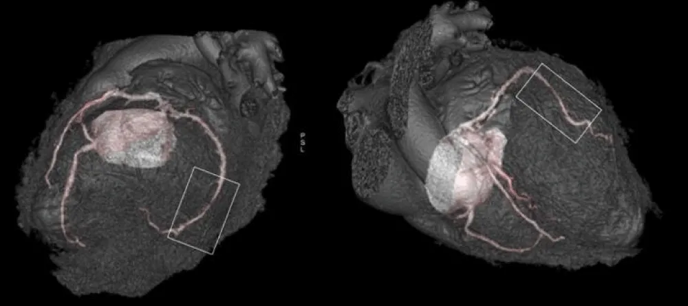 Figure 2: Volume-rendering three-dimensional CTCA images in an LAO and RAO projection. The dissected suboccluded segment is included in the box.