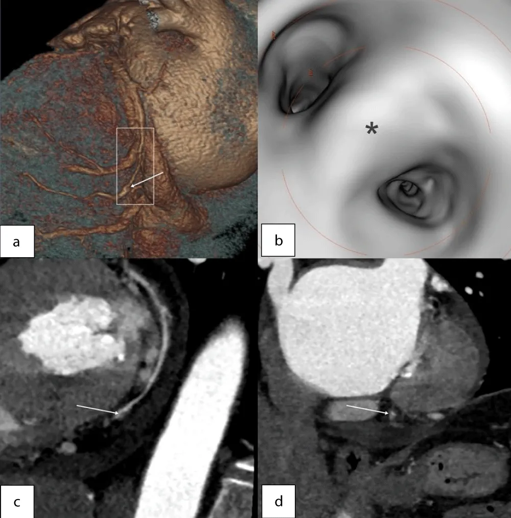 The medical history and the CAG findings induced us to suspect a recurrent SCAD, affecting a new coronary vessel. In this specific case, the angiographic findings obtained were ambiguous, since also coronary embolism can present with abrupt occlusion, often of a distal coronary territory, and both often resolve over time with restoration of normal coronary flow. Intravascular ultrasound (IVUS) and optical coherence tomography (OCT) are dedicated intracoronary imaging methods that can provide more accurate diagnostic information [2]. IVUS requires closer scrutiny to discriminate between plaque rupture and SCAD lesions, whereas OCT offers better spatial resolution (at the expense of lower depth of penetration), delineation of the lumen-intimal interface, and visualization of smaller lesions. However, neither study is exempt from risk or complications, such as extending the current dissection or creating a de novo dissection with the wire or catheter. Additionally, the obtained information (i.e., length of the false lumen or size of the intramural hematoma, among others) most likely would not have affected the decision to undertake a conservative approach, for the absence of indications for urgent percutaneous coronary intervention (PCI) or bypass surgery. So, we decided on medical therapy with dual antiplatelet drugs, statin, and ACE inhibitors, and we scheduled the patient for a follow-up CTCA after a week. The multiphase CTCA, performed using retrospectively electrocardiographically gated imaging and iterative image reconstruction, showed distal sub-occlusion of LCx and unveiled an intima-medial flap dissection (Figure 3 b-d) upstream of a long tapered distal segment, of about three centimeters in length [Figure 2, Figure 3a], that confirmed the suspicious of a type 2 SCAD [Figure 3b].