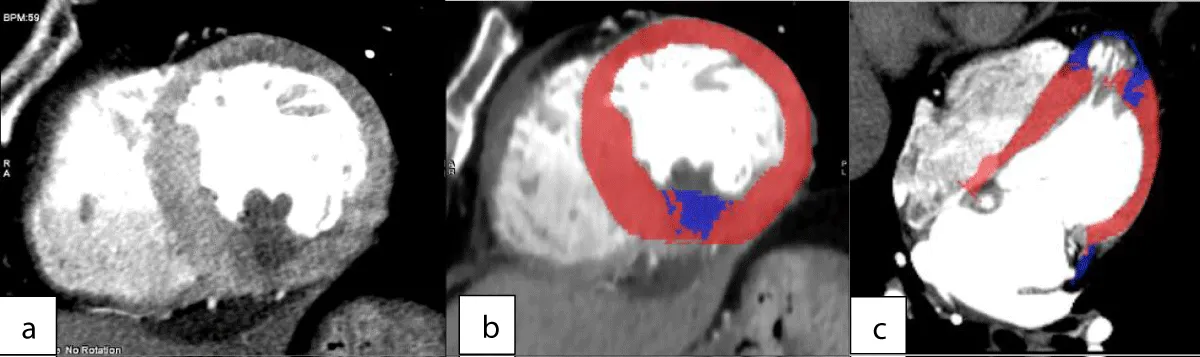 Figure 4: a-b: Short-axis CTCA and short-axis CT myocardial perfusion images with a color-coded map show hypoperfusion (blue color) of the inferno-posterior wall, corresponding with the vascular territory of the coronary artery involved by SCAD; c: Long-axis CT myocardial perfusion image with a color-coded map shows myocardial hypoperfusion (blue color) of the apical wall (site of aneurysm), corresponding with the vascular territory of the coronary arteries involved by the previous two SCAD of distal LAD and PLA.