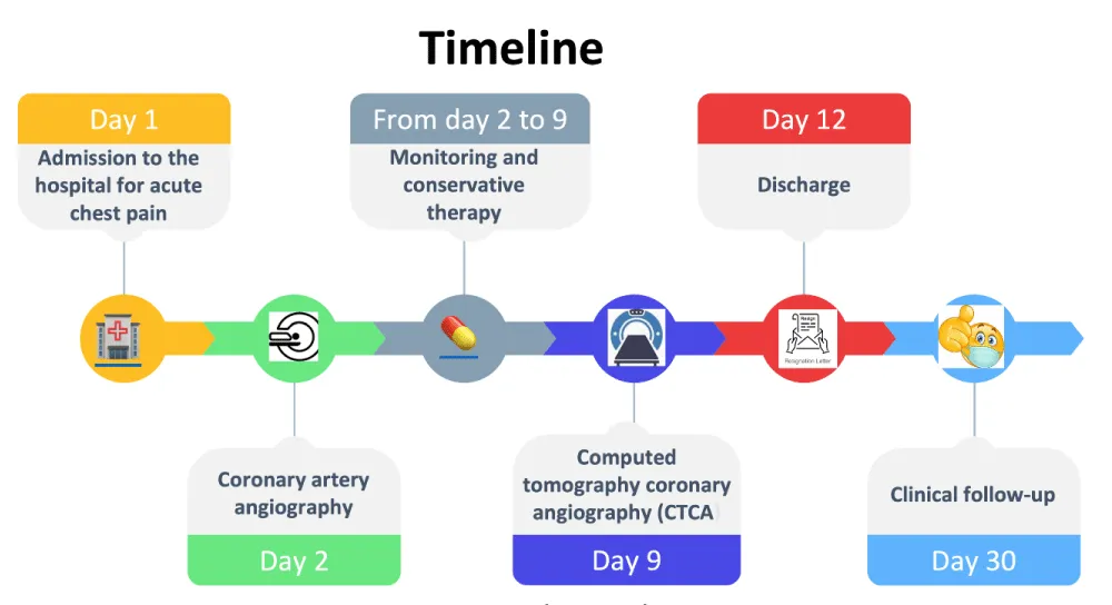 The patient was discharged home the next day, the twelfth day of hospitalization (Figure 5), with not experienced major cardiac arrhythmias or recurrent episodes of angina; she was prescribed a more appropriate antihypertensive and antidyslipidemic treatment, as well as a dual antiplatelet therapy, clopidogrel on top of aspirin. At 1 month follow-up, she reported no symptoms, good arterial blood pressure control, and normal levels of serial biomarkers (LDL-C 45 mg/dl), so clopidogrel was stopped.