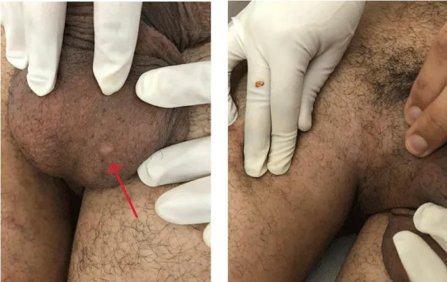 Figure 1: Image showing genital scars (red arrow).