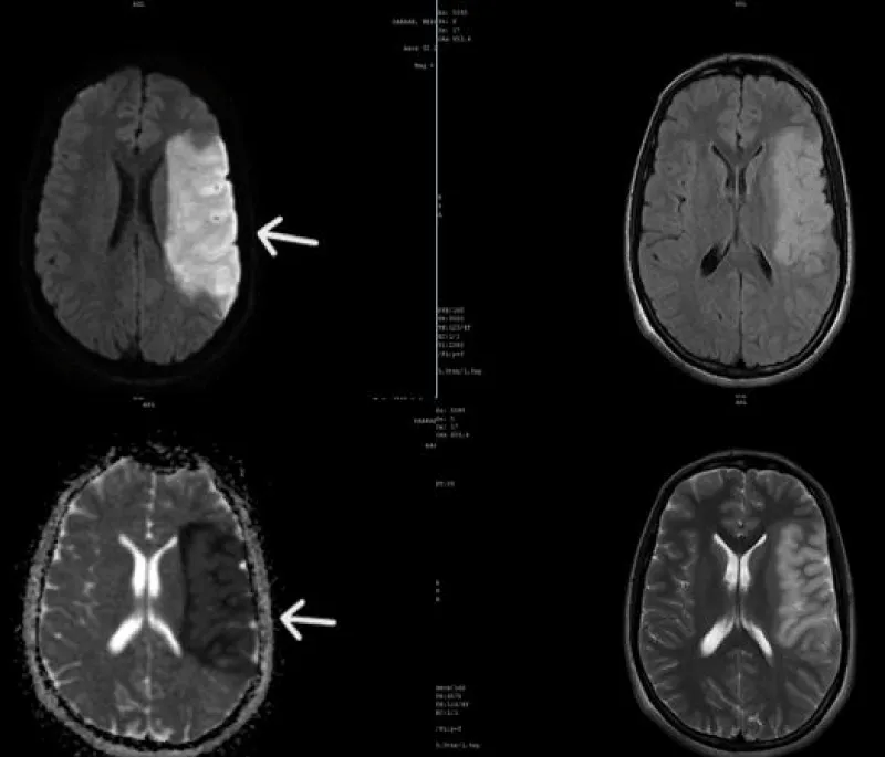 An urgent brain MRI was performed, revealing an extensive area of ischemia in the left middle cerebral artery territory with mass effect but no signs of hemorrhagic infarction (Figure 2).