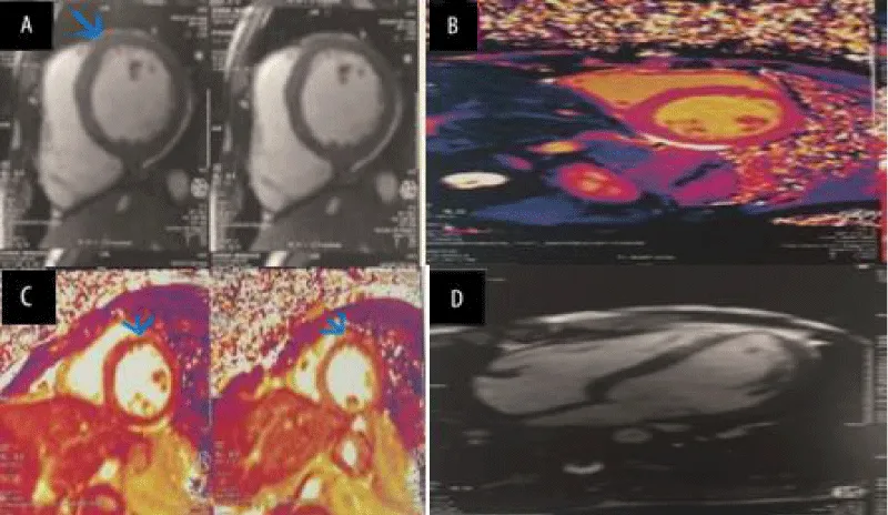 Cardiac MRI (CMRI) is an essential tool for assessing the extent of inflammation and myocardial damage. The examination often reveals myocardial hyperintensity on T2-weighted sequences, indicating myocardial edema, as well as abnormal contrast uptake on late gadolinium enhancement sequences, suggesting the presence of myocardial fibrosis or necrosis. CMRI also allows for the measurement of the impact of myocarditis on cardiac function by detecting potential abnormalities in contractility and diastolic function. These features help confirm the diagnosis of myocarditis and guide the clinical follow-up of patients with Behçet’s disease [17,18].
