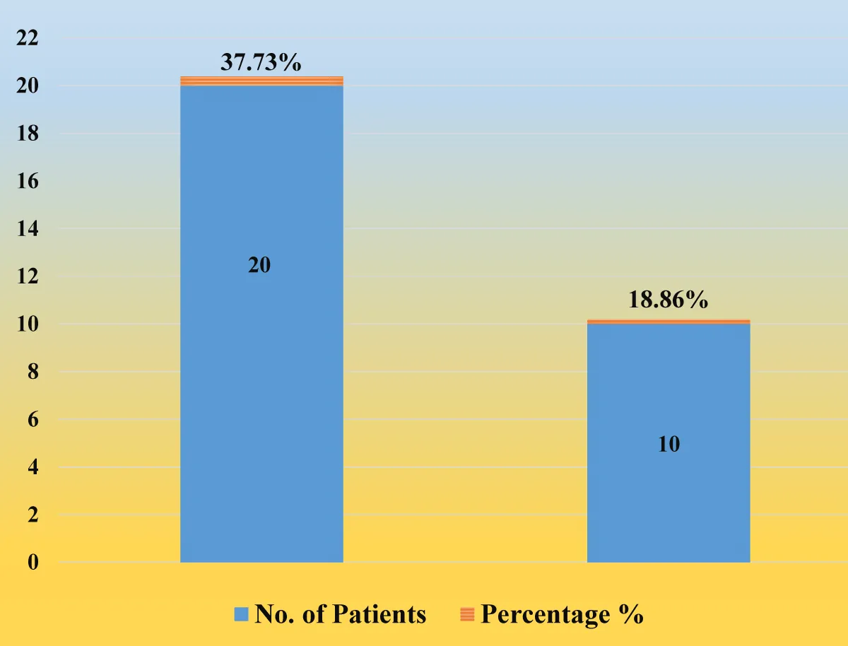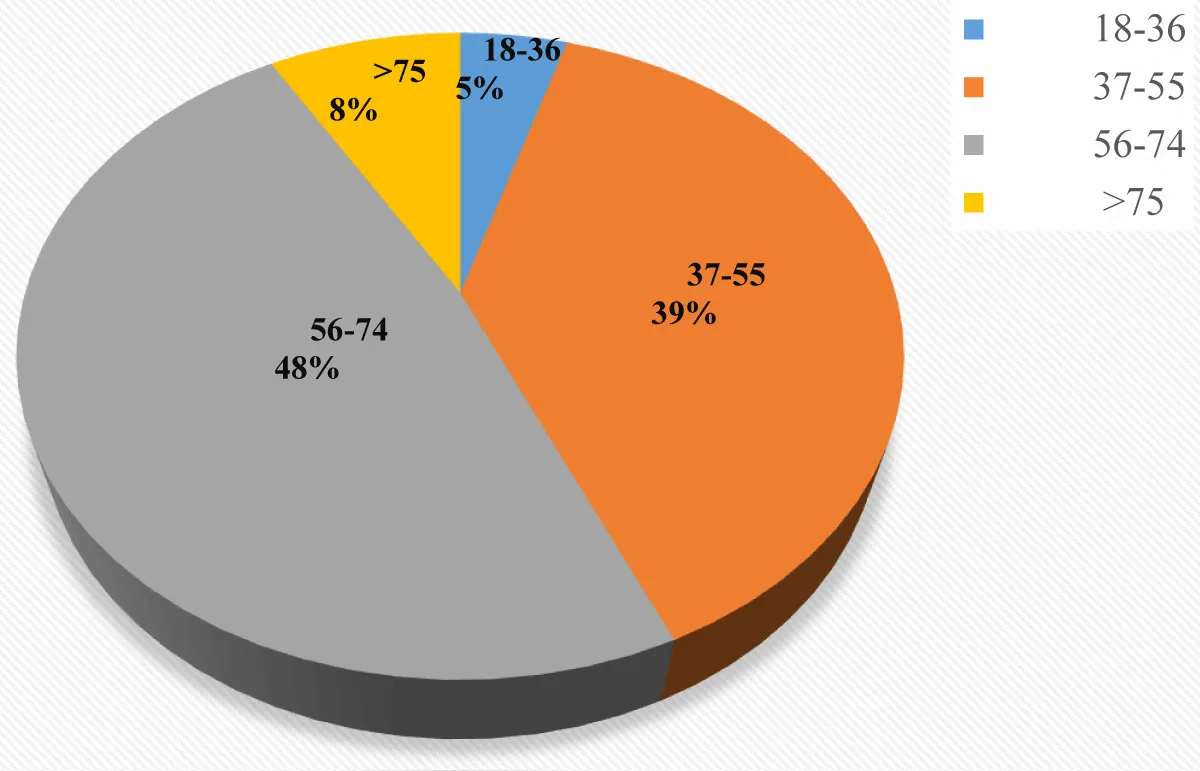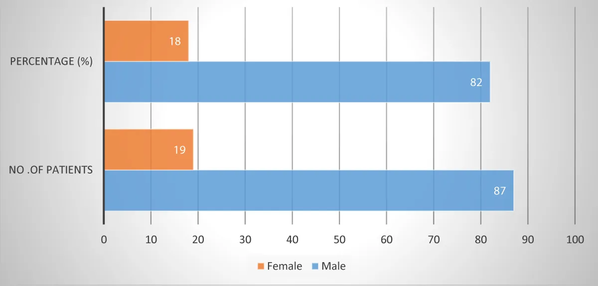 A. Distribution of subjects based on gender and age: Table 1 represents the demographics of the study participants, where n = 106 individuals in total, with male patients making up the majority with 87, or 82%, and female patients (Figure 1) following with 19, or 18%, age group 56 - 74 (48%) patients are highest in number, followed by 37 - 55 (39%), >75 (8%) and 18 - 36 (5%),(Figure 2) respectively.