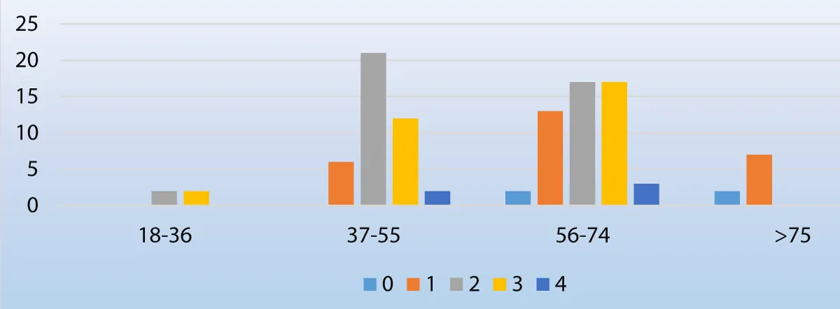 C. Distribution of subjects by dapt score based on age intervals: By using the DAPT Score Calculator the DAPT score of every individual has been calculated depending upon the patient comorbidities, indications, and condition (Table 3 and Figure 4). As per the DAPT Score based on age intervals, the age group of 56 – 74 patients shows the DAPT Score 0, 1, 2, 3, and 4, with 02, 13, 17, 17, and 03, respectively. Age range 37 – 55 records the DAPT Score 1, 2, 3, and 4, with a number of patients 06, 21, 12, and 02, respectively. Age group >75: records 02, and 07 patients with DAPT Score 0, and 1, respectively. For the age range of 18 to 36, the DAPT Score 2, and 3 is marked with 2 patients each.