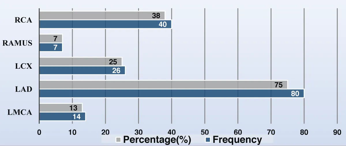 D. Distribution of subjects based on coronary stent placement: By analyzing the collected data, the coronary stent placement location has been determined for better study purposes. For better study purposes, the location of the coronary stent implantation has been established, with the majority of stent placement frequency to LAD - 80(75%), followed by RCA-40 (38%), LCX-26-(25%), LMCA-14(13%), and RAMUS-07-(07%) (Table 4 and Figure 5).