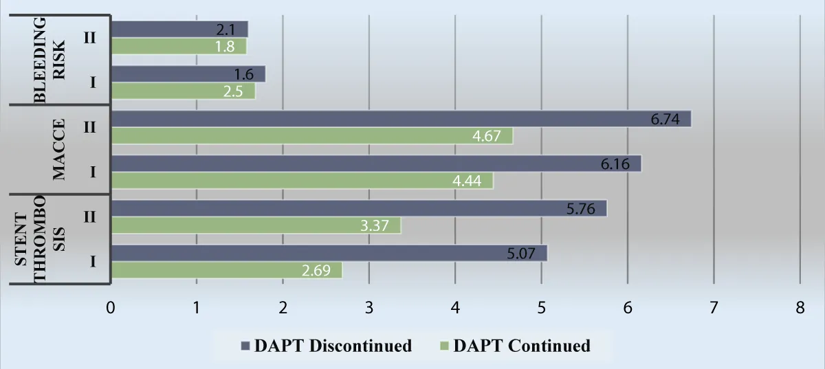 | Table 7: Comparing the risk of Stent Thrombosis, MACCE, and Bleeding Risk in two treatment groups if the therapy is discontinued. | |||