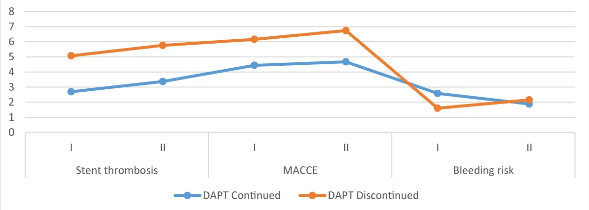 Figure 8: The risk difference between DAPT continued and discontinued in Groups I and II.