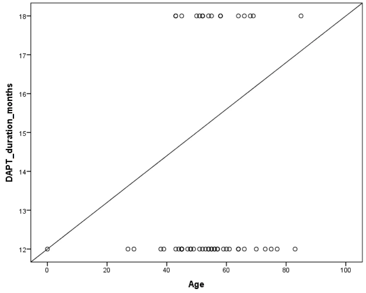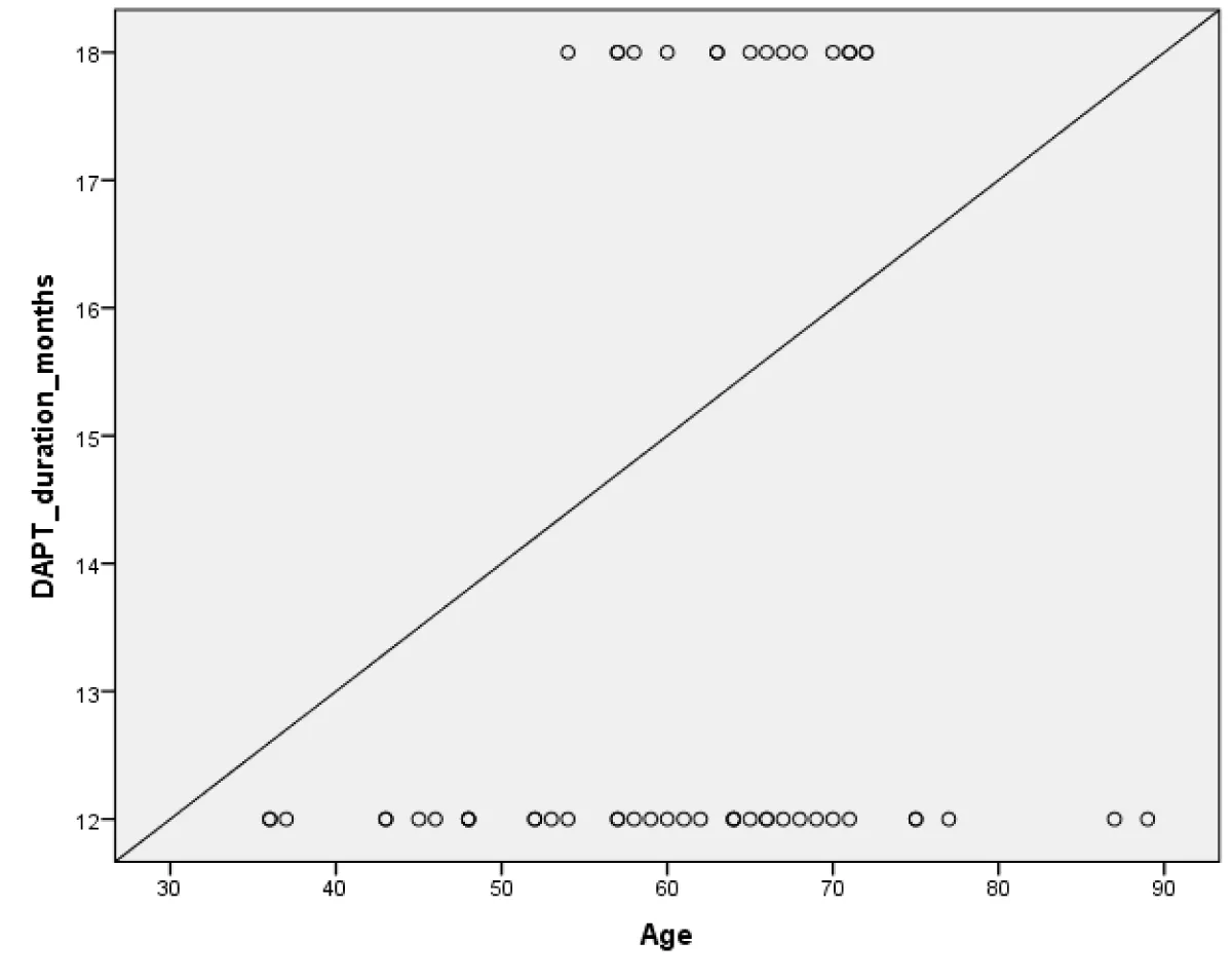 Correlation between DAPT duration and age in Group I with ECOSPRIN+TICAGRLOR treatment was not found to be significant as seen in Figure 10. Similar results were also found for that in Group II with ECOSPRIN+CLOPIDOGREL treatment (Figure 11).