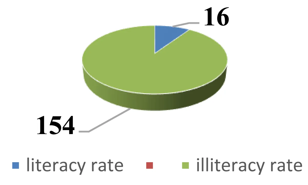 Table 2: The data represents the literacy distribution among a total of 170 patients. Out of the total, 16 patients (9.4%) were literate, while a significantly larger group of 154 patients (90.58%) were illiterate. This indicates that the majority of the patients had not received formal education. The table underscores a high illiteracy rate within the patient population surveyed (Figure 2).