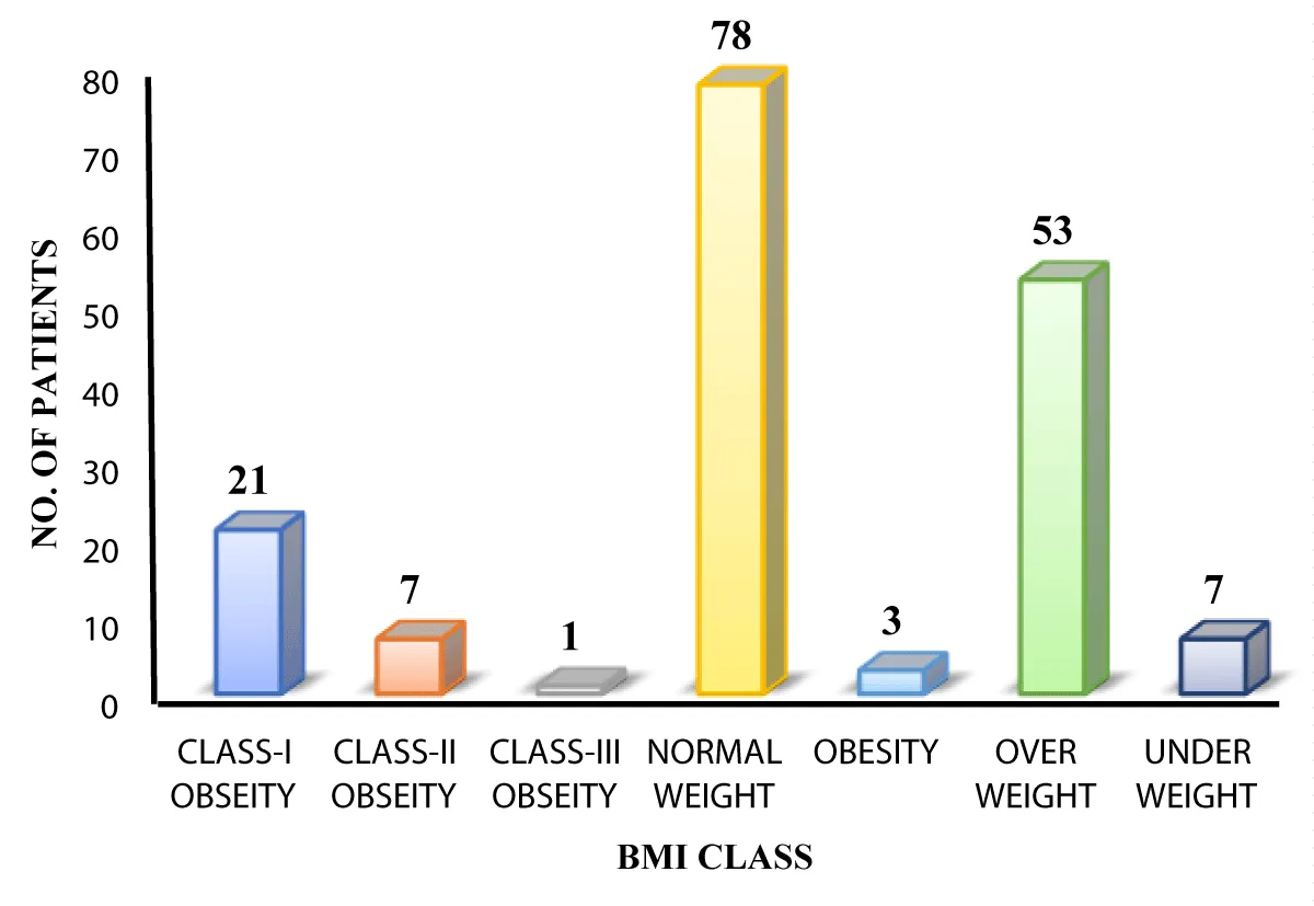 Table 3: Distribution based on BMI as shown in Table 2. Among 170 selected subjects most of the patients were overweight (n = 53), 31.17%, while the fewest were in class-III obesity 1 patient, 0.588%. The breakdown includes 7 underweight patients, 78 with normal weight, 3 with obesity, 21 in class-I obesity, and 7 in class-II obesity. This data highlights that overweight individuals formed the largest group, whereas severe obesity was rare (Figure 3).