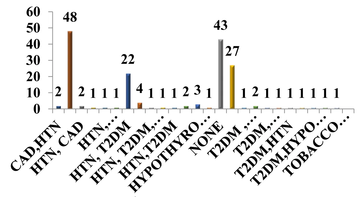 A majority of the patients had a normal weight (45.88%) or were overweight (31.17%), with fewer in other categories. Being overweight can increase the risk of atherosclerosis, highlighting the importance of weight management. The most common risk factor was hypertension (28.23%), followed by a combination of hypertension and Type 2 Diabetes Mellitus (14.11%). Other prevalent conditions included coronary artery disease and thyroid disorders.