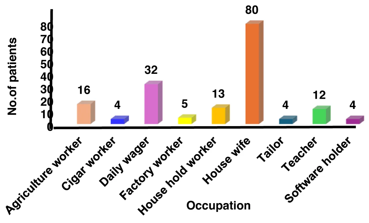 Table 5: Distribution based on occupation as shown in Table 4. Most of the highest incidence was observed among housewives, accounting for 47.05% (n = 80). Followed by daily wagers at 18.82% (n = 32), agriculture workers at 9.41% (n = 16), and household workers at 7.64% (n = 13). Teachers comprised 7.05% (n = 12) of the cases, while factory workers represented 2.94% (n = 5). Additionally, cigar workers, tailors, and software professionals each accounted for 2.35% (n = 4) of the cases (Figure 5).
