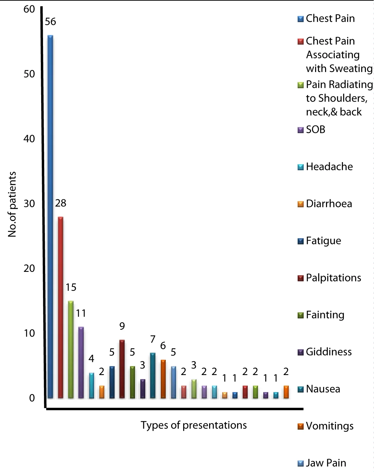 In terms of occupation, housewives (47.05%) and daily wage earners (18.82%) were most affected, likely due to socio-economic factors, sedentary lifestyles, and limited access to healthcare. Chest pain was the most frequent symptom, followed by shortness of breath and sweating. Atypical symptoms, such as jaw pain and confusion, were also observed, underscoring the need for careful clinical evaluation.