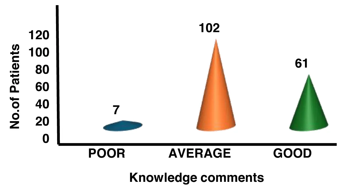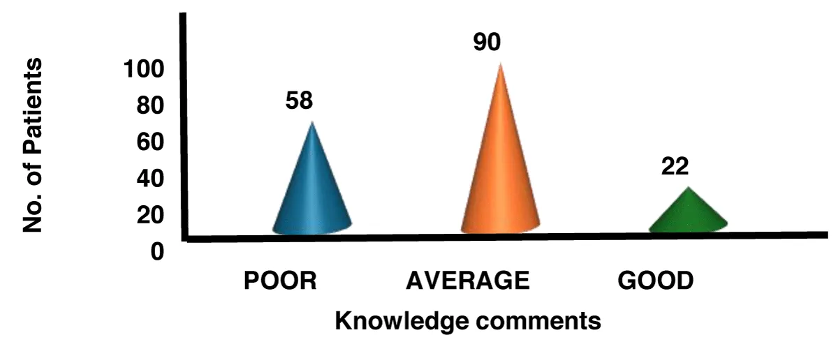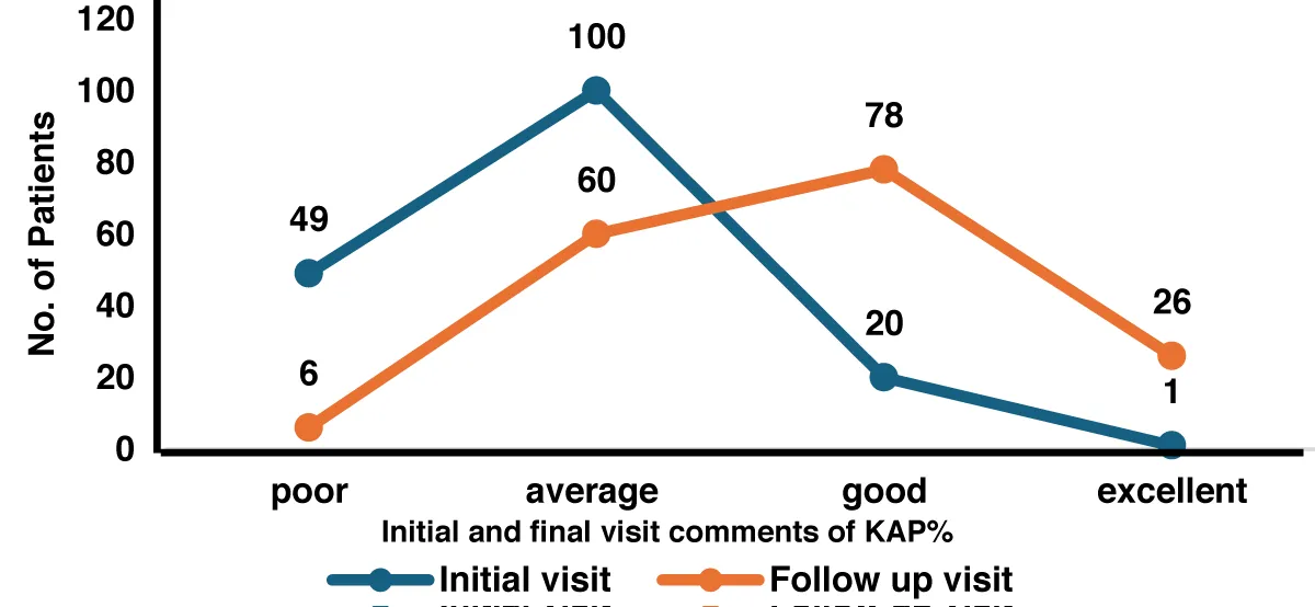 Table 10: Distribution based on overall KAP scoring at Initial visit as shown in Table 9. A significant portion of the patients, 87 individuals (51.17%), were classified as having a poor KAP score, indicating that more than half of the patient population demonstrated lower levels of knowledge, attitude, and practice. The next largest group, 77 patients (45.3%), had an average KAP score, suggesting that many patients performed at a moderate level in these areas. Only 6 patients (3.52%) were classified as having a good KAP score, reflecting a very small proportion with higher knowledge, attitude, and practice. This distribution emphasizes that most patients fall within the average to poor range in terms of KAP (Figure 10).