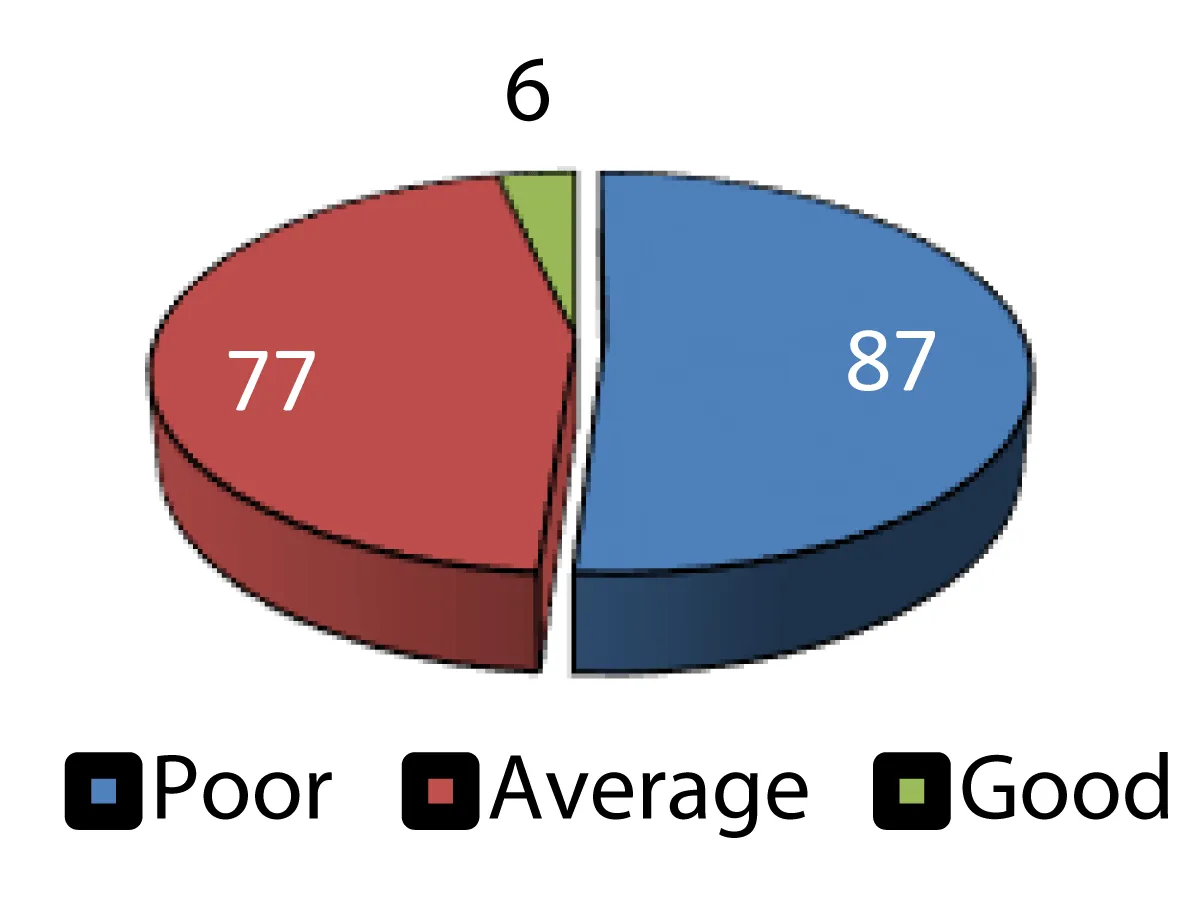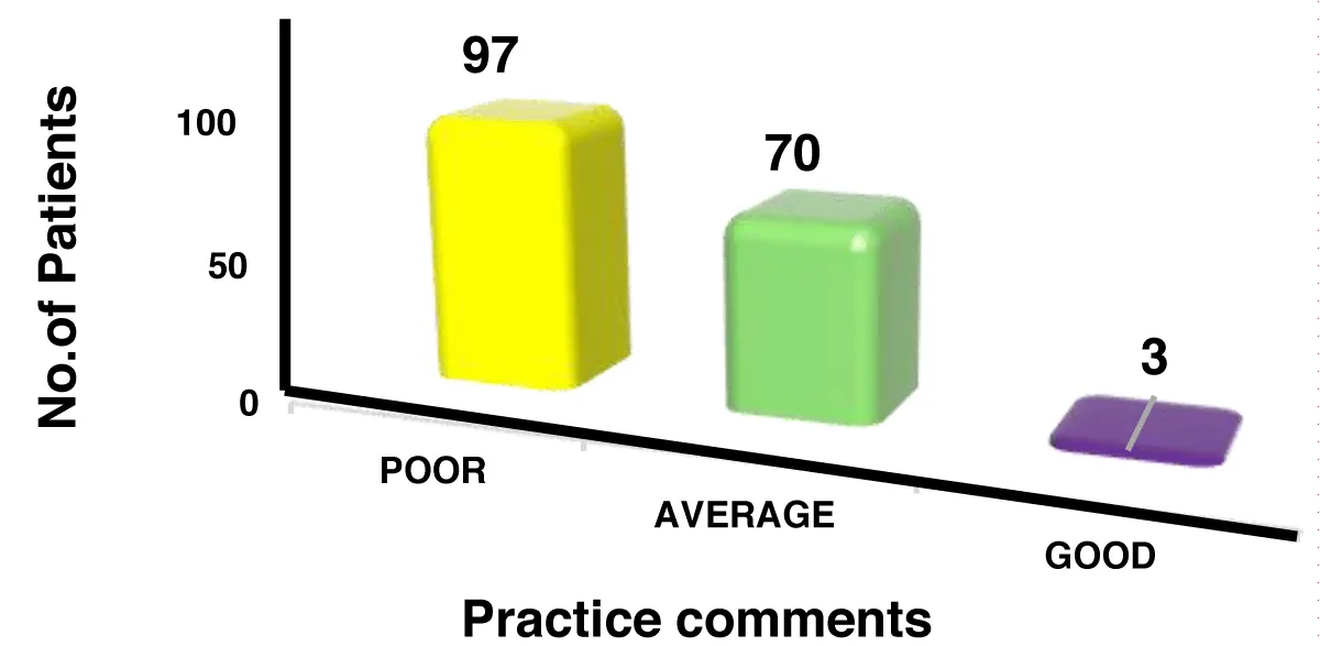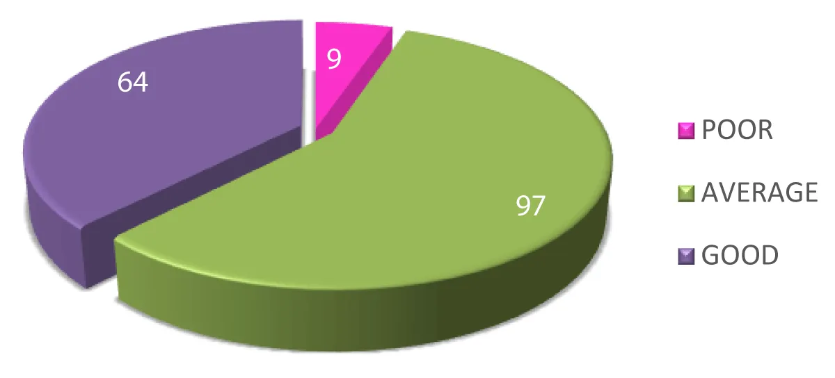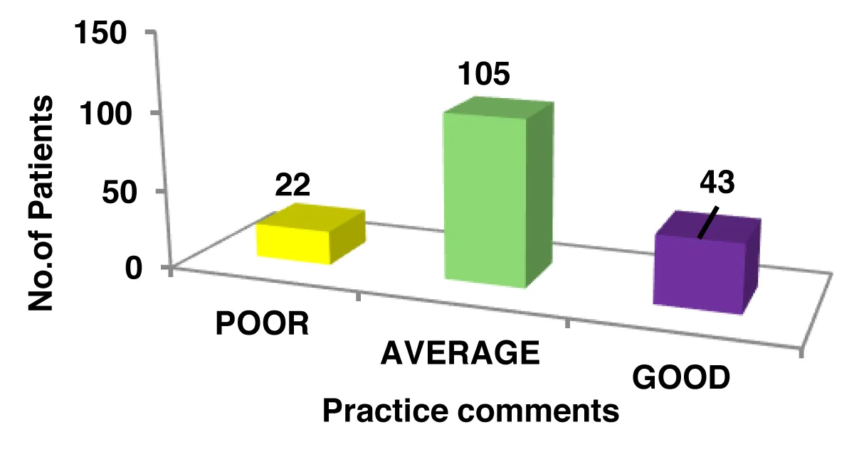Table 9: Distribution based on practice levels at initial visit as shown in Table 8. The data shows that most patients had average practice n = 70(41.17%). Followed by poor practice has n = 97(57.05%), fewer in good practice has n = 3(1.76%) (Figure 9).