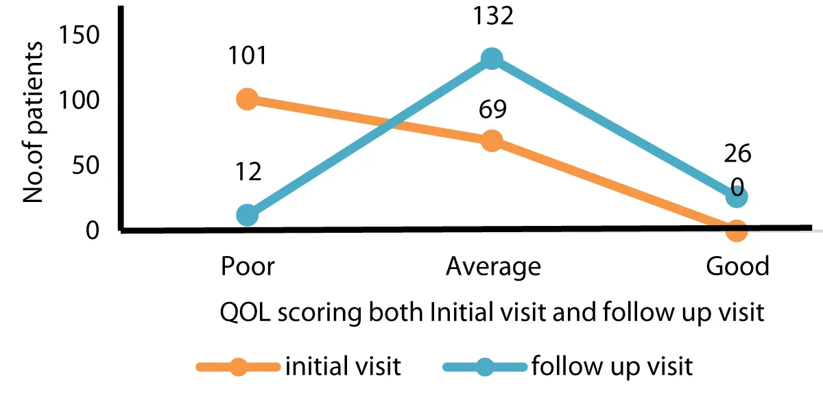 Figure 16: Distribution based on overall QOL scoring of both Initial and Follow up visit of study population.