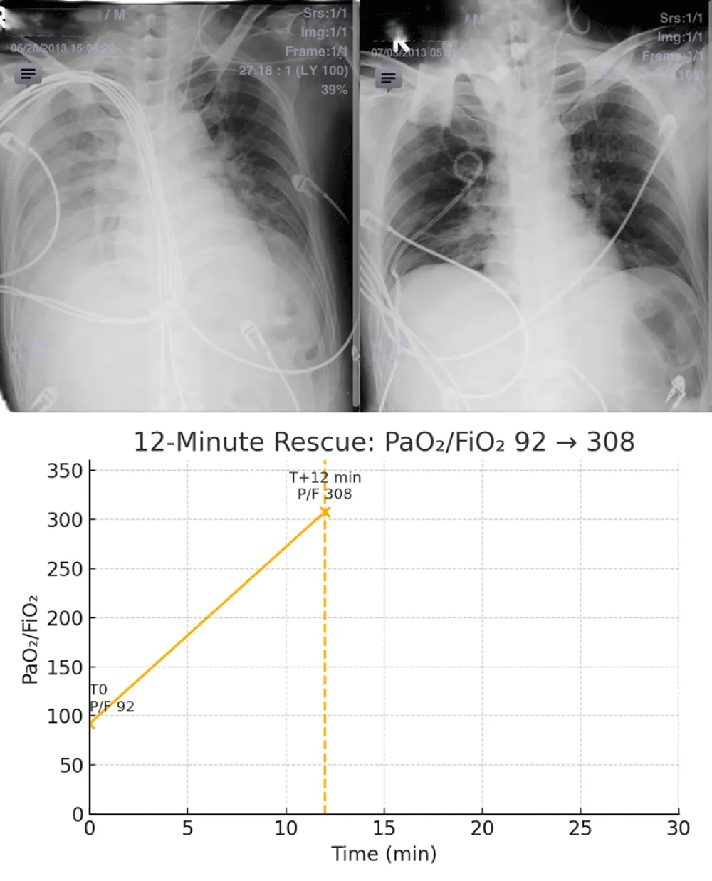 Taken together, these changes constitute a 12‑minute rescue, with PaO₂/FiO₂ rising from 92 to 308 and hemodynamics stabilizing, thereby enabling same‑day ORIF.