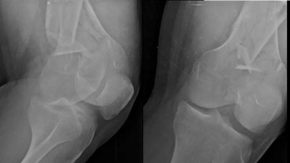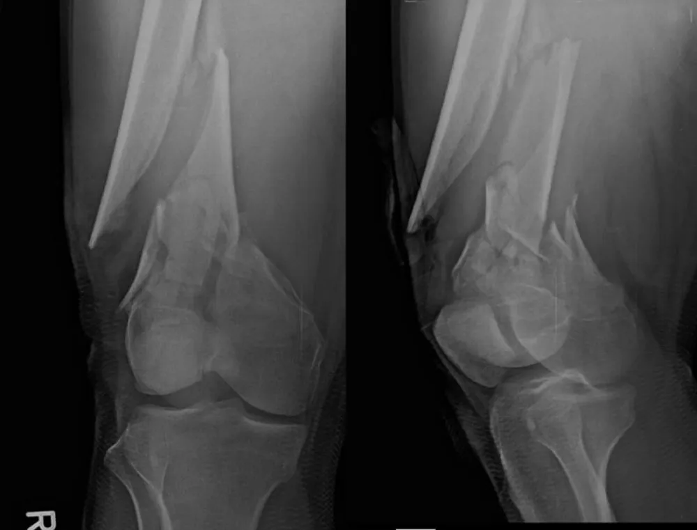 Figure 2: Pre-operative imaging of distal femur fractures. Representative lateral views demonstrate bilateral open distal femur fractures (right Gustilo‑Anderson II; left I).