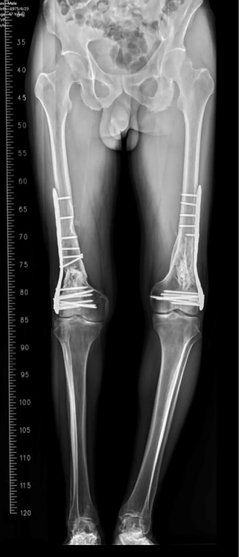 Outcome: Postoperative recovery was uneventful; long‑leg follow‑up radiographs confirmed bony healing.