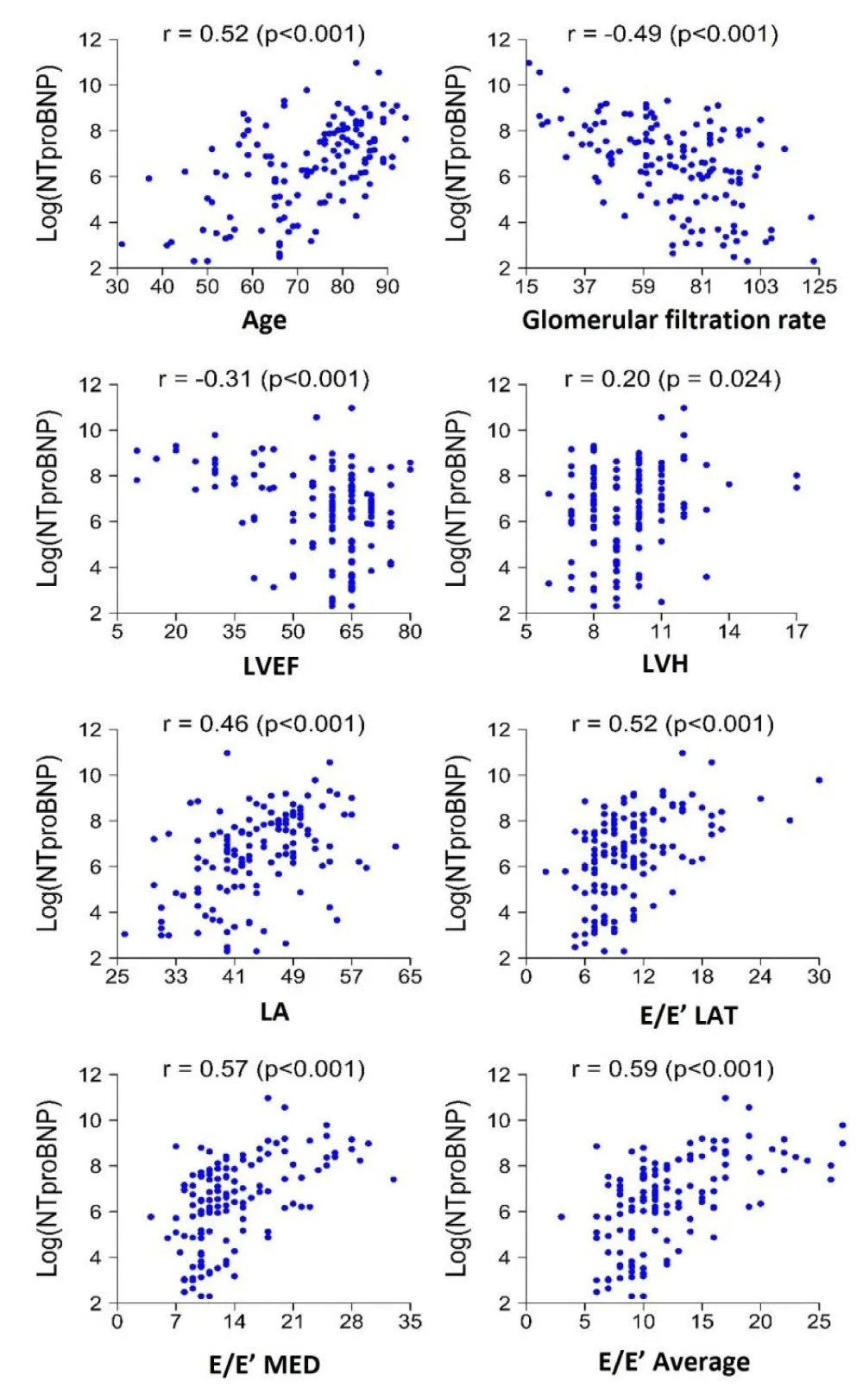 Figure 1: Plot demonstrating the correlation of echocardiographic parameters with NT-proBNP levels. LVEF, left ventricular eyection fraction; LVH, left ventricular hypertrophy; LA, left atrium.