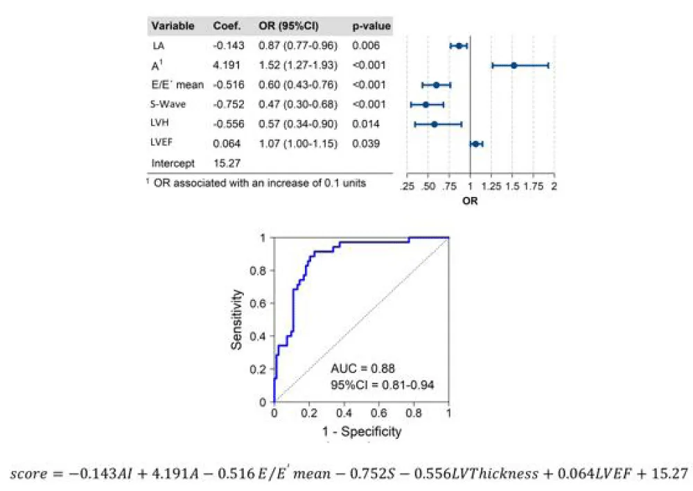 Results: A total of 134 patients (68 female) were included. LV thickness, E/E’ lat, E/E’ med, E/E’ average, S-wave, E-wave, and IVC diameter were significantly associated with NT-proBNP levels ≥300 pg/ml. In contrast, LVEF, A-wave, and TAPSE were negatively correlated with NT-proBNP levels ≥300 pg/ml. E/E’ ratio >15 was found to be significantly related to NT-proBNP ≥300 pg/ml (p = 0.007), with a positive predictive value of 95%. The model with the highest predictive power for NT-proBNP levels of ≥300 pg/ml included LA diameter, A1, E/E’ mean, S-wave, LV thickness, and LVEF ((AUC 0.88 (0.81 – 0.94)).